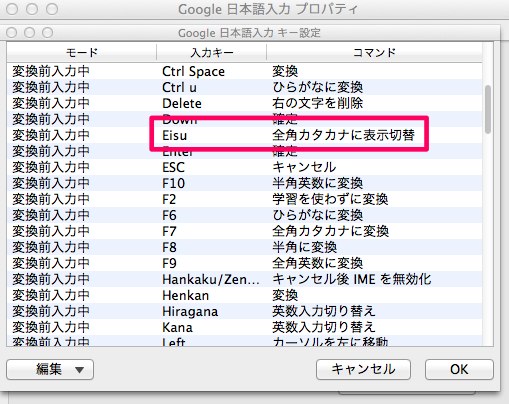 多分そんなやつ俺しかいないと思うけど、スペースキーの左にある[英数]キーをクリックするとカタカナに変換出来るようにしたい場合、Google日本語入力のカスタマイズで出来そうなのだが、今のところ失敗に終わっている。。。