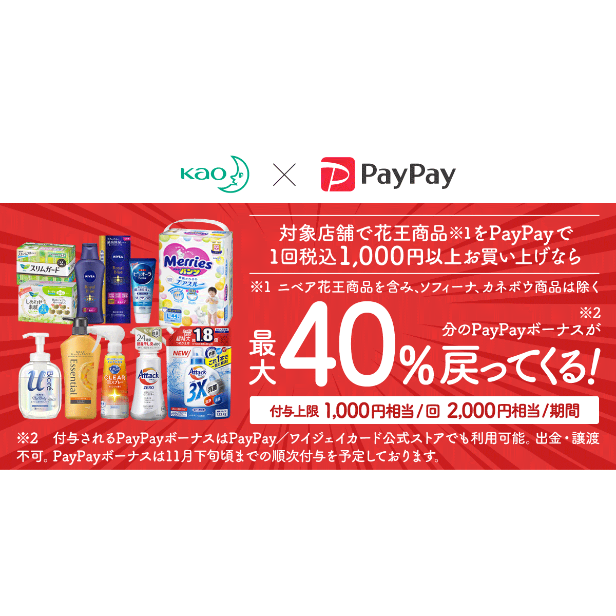 付与上限:1,000円相当(2,500円決済)、期間上限:2,000円相当(5,000円決済)