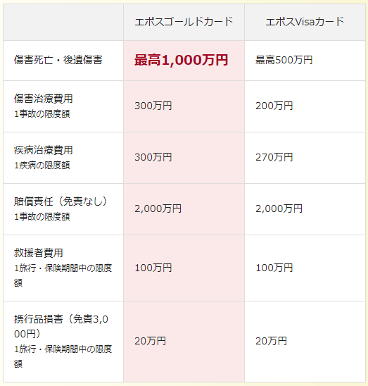 通常カードでは一番上の障害死亡・後遺障害(ようするに死亡時)が弱いがこれだけは複数のカードの保険を足す事が出来る。