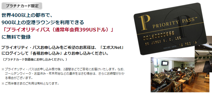 それでいて世界中の空港ラウンジが使えるプライオリティパスがもらえる。