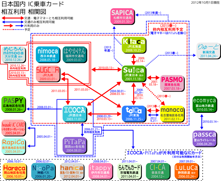 とは言え首都圏ではSuicaとPasmo、関西圏ではICOCAとPiTaPa、中部ではTOICAとmanacaといったJR系と私鉄系の相互利用はすでに始まっているし、前者のJRはほぼ全国で相互利用可能となっている。