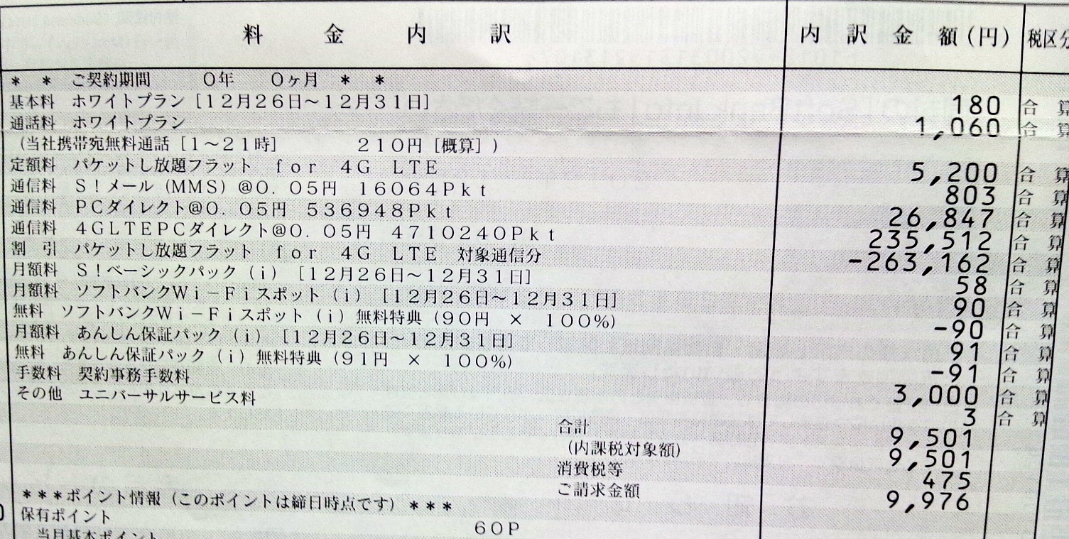 まぁ勉強になったわ。と諦めていたところソフトバンクから12月度の明細が来た。