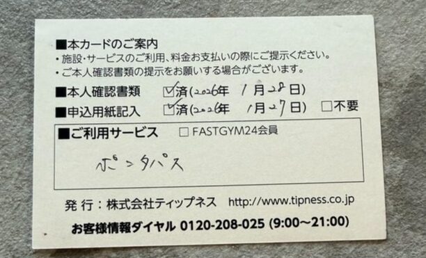 私の近所のティップネスでは、初回は、利用に関する動画の視聴や規約の同意などを行った上で簡単なマシンの説明などがあったが、帰りに半年間有効な簡易的な会員カードを発行してくれ、2回目以降は窓口でカードを提示し500円支払うだけで利用可能となった。