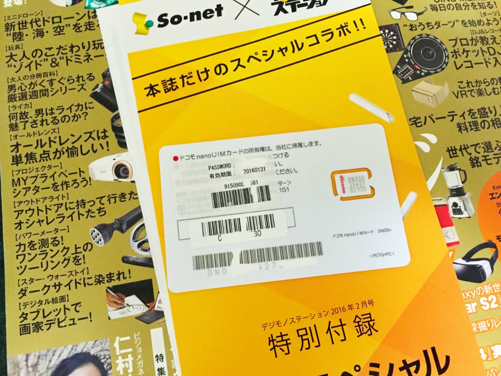 知らない方に簡単に説明しておくと、昨年12月25日、永年無料で月500MBまでLTE通信が出来るSo-netのSIMが付録に付いたデジモノステーション2016年2月号が発売した。