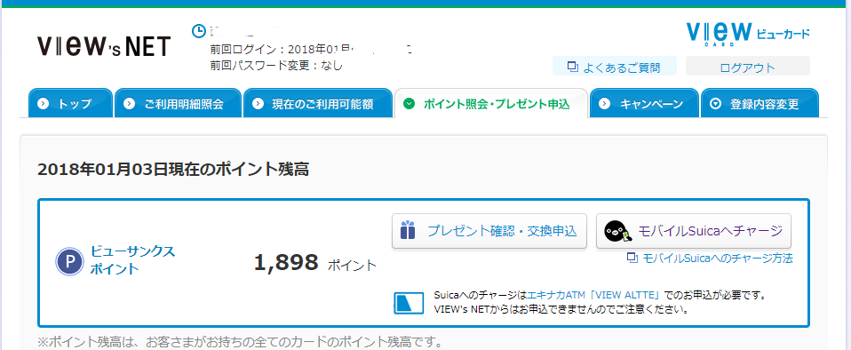 まずはVIEW’s NETにログインし、右上の「ポイント照会・プレゼント申込」を選ぼう。