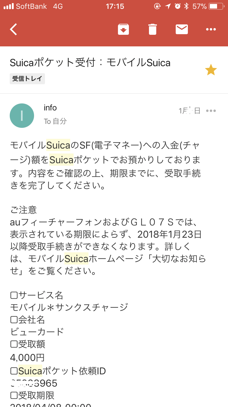 上記メールの下部にあるURLをクリックするとSuicaアプリが起動する。