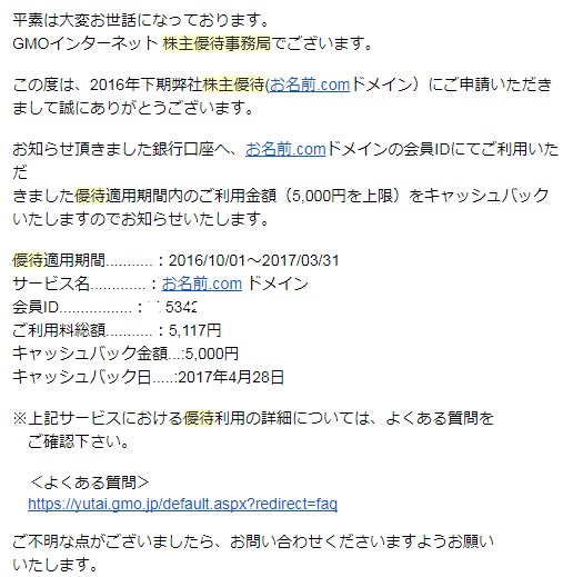 前回の優待はお名前.comのドメイン代に使ったのだが、その時は、まずクレジットカードで通常通り支払いし、その後申請(銀行口座を指定)を行うと5,000円を上限に”キャッシュバック”された。